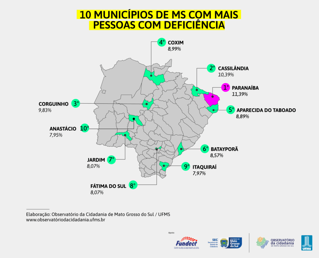 O Painel do OCMS apresenta os municípios de Mato Grosso do Sul conforme a proporção de pessoas com deficiência em sua população. Paranaíba lidera a lista, com 11,39%, seguida por Cassilândia (10,39%), Corguinho (9,83%), Coxim (8,99%) e Aparecida do Taboado (8,89%).