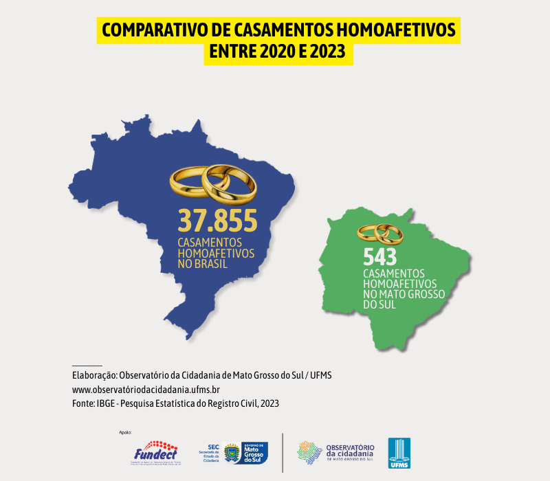 A partir dos dados da Pesquisa Estatística do Registro Civil (IBGE), o painel mostra que, de 2020 a 2023, o Brasil registrou 37.855 casamentos entre pessoas do mesmo sexo e, em Mato Grosso do Sul, foram 543 uniões homoafetivas formalizadas nesse mesmo período, com predominância de casamentos entre cônjuges do sexo feminino, tendência também observada no cenário nacional. Os dados mostram que Campo Grande registrou 325 casamentos, seguida por Dourados, com 59; Três Lagoas, com 27; Ponta Porã, com 8; e Bonito, com 6.
