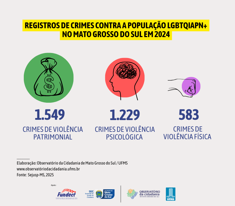 O painel apresenta dados sobre registros de crimes contra a população LGBTQIAPN+ no Brasil e em Mato Grosso do Sul, além de ocorrências por orientação sexual entre 2019 e 2025, de procedimentos instaurados e de violência sexual, psicológica, moral, física e patrimonial nos últimos seis anos. O levantamento é feito com base nas informações disponibilizadas pela Sejusp/MS e pelo Anuário de Segurança Pública.
