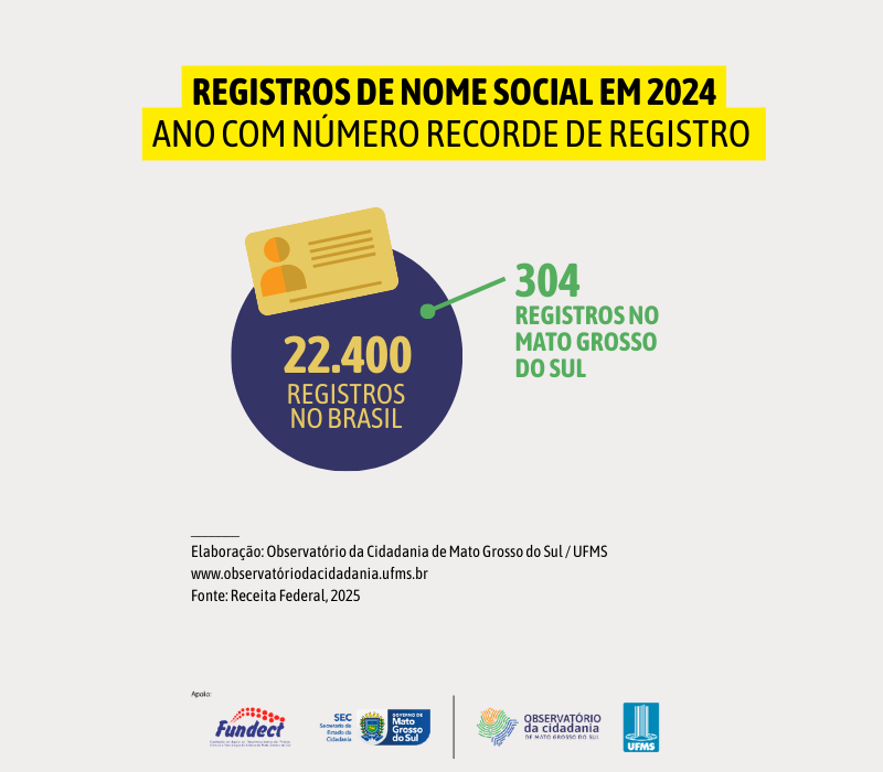 Em Mato Grosso do Sul, o total de registros de Nome Social em 2024 foi de 304, segundo a Receita Federal, no país, foram contabilizados 22.400. Em Campo Grande foram 149 registros; em Dourados, 27; em Três Lagoas, 11; e em Corumbá, Ponta Porã e Angélica, 9 cada uma.